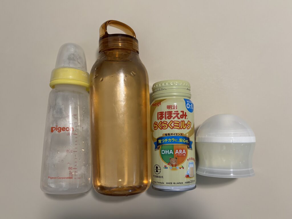 - 液体ミルク: お湯がない時と非常時用。温め不要でこのままあげられるミルク。120mlと200mlがあるため、出かける距離に応じて入れ替えています。